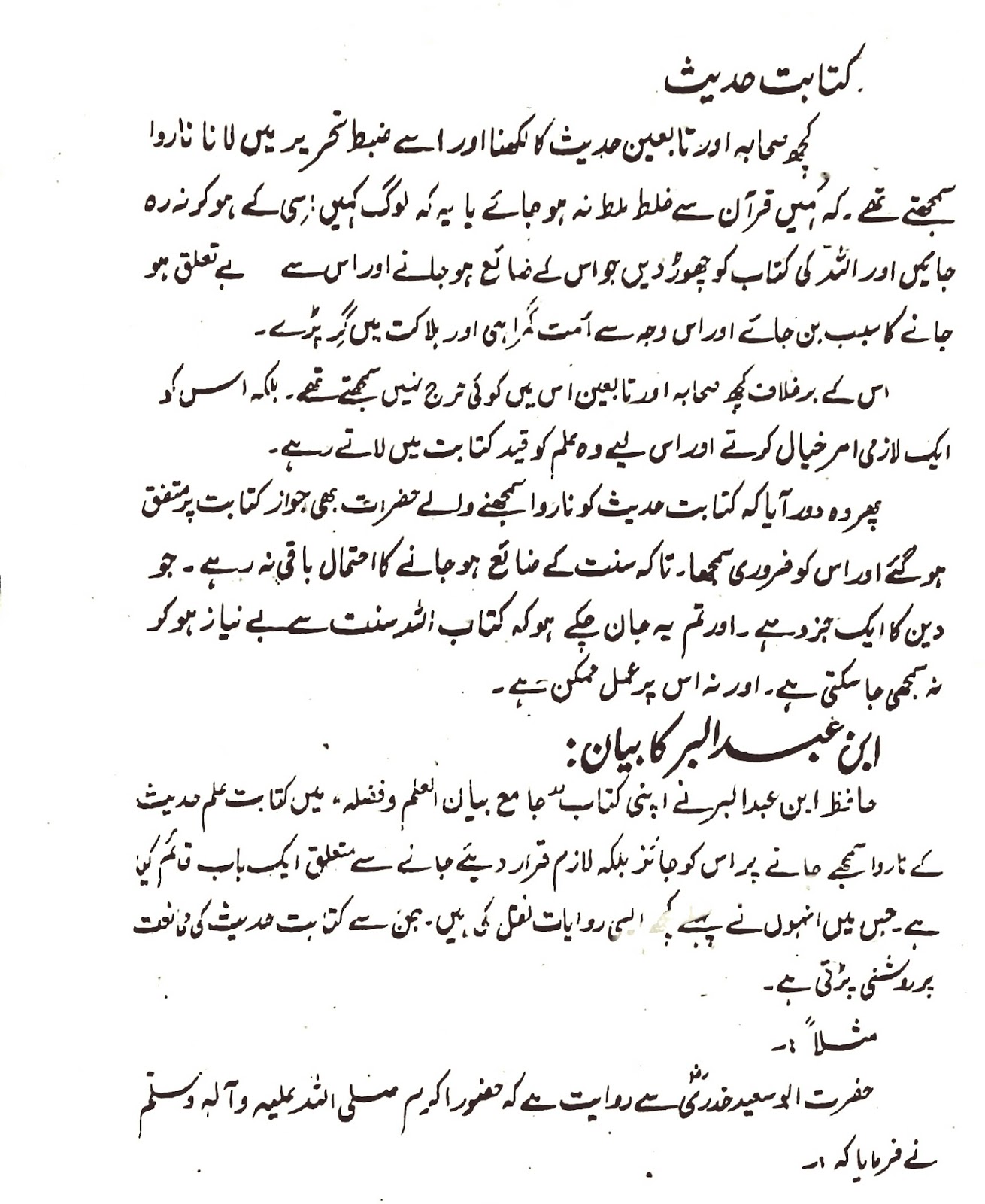 “حضرت ابوسعید رضی اللہ عنہ سے روایت ہے، انہوں نے کہا کہ ہم نے آنحضرت صلی اللہ علیہ وسلم سے لکھنے کی اجازت طلب کی تو آپ صلی اللہ علیہ وسلم نے اجازت نہ دی۔ اس کے علاوہ یہ حدیث زید بن اسلم سے بھی مروی ہے۔” (جامع الترمذي ج2ص102)