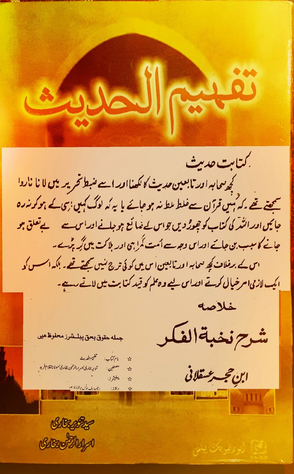 “کتابت حدیث” – ” نخبة الفکر” کی شرح کے خلاصہ و ترجمہ سے انتخاب ہے جو حدیث کی کتابت سے متعلق اصحابہ کرام رضی الله کی دو مختلف آراء پر روشنی ڈالتا ہے – ” نخبة الفکر” علامہ ابن حجرالعسقلانی کی تصنیف ہے- قرون وسطیٰ کے محدثین میں علامہ ابن حجرالعسقلانی کا نام سر فہرست ہے ، آپ کا عہد چودہویں صدی عیسوی کے نصفِ اول کے آخرسے لے کر پندرہویں صدی عیسوی کے نصفِ اول تک کا ہے۔ آپ نامور مؤرخ ، فقیہ تھے۔مصر میں پیدا ہوئے۔ علوم حدیث میں سند شمار ہوتے ہیں۔ آپ کو شیخ الاسلام کے نام سے بھی یاد کیا جاتا ہے۔ ان کی کتابوں کی تعداد 150 سے اوپر بتائی جاتی ہے۔ مشہور کتابوں میں الاصابہ فی تمييز الصحابہ : اصحاب رسول کے متعلق ایک جامع انسائیکلوپیڈیا ہے جو اب اُردو میں بھی شائع ہوچکا ہے۔ فتح الباری شرح صحیح البخاری : علامہ ابن حجر عسقلانی یہ عظیم تصنیف ایک شاہکار سمجھی جاتی ہے، یہ کتاب عقائد، فقہ، اور حدیث کا شاہکار ہے۔
