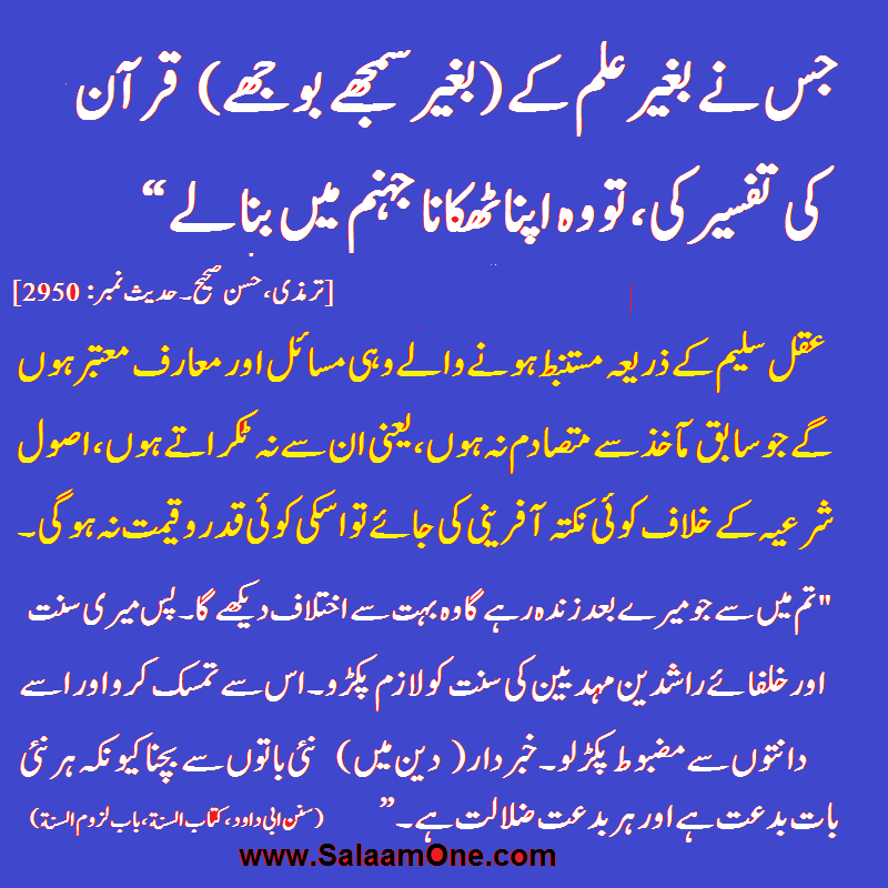 جو شخص قرآن کے معاملے میں (محض) اپنی رائے سے گفتگو کرے اور اس میں کوئی صحیح بات بھی کہہ دے تب بھی اس نے غلطی کی۔ (ترمذی،باب ماجاء فی یفسر القرآن ،حدیث نمبر:۲۸۷۴)